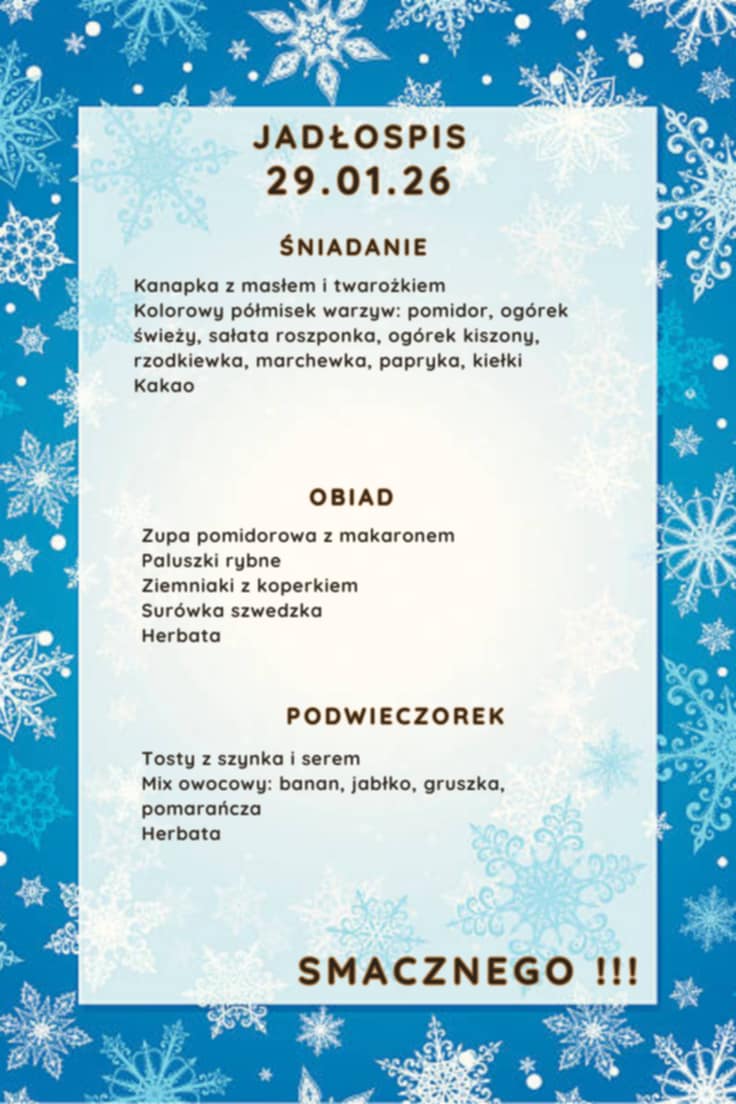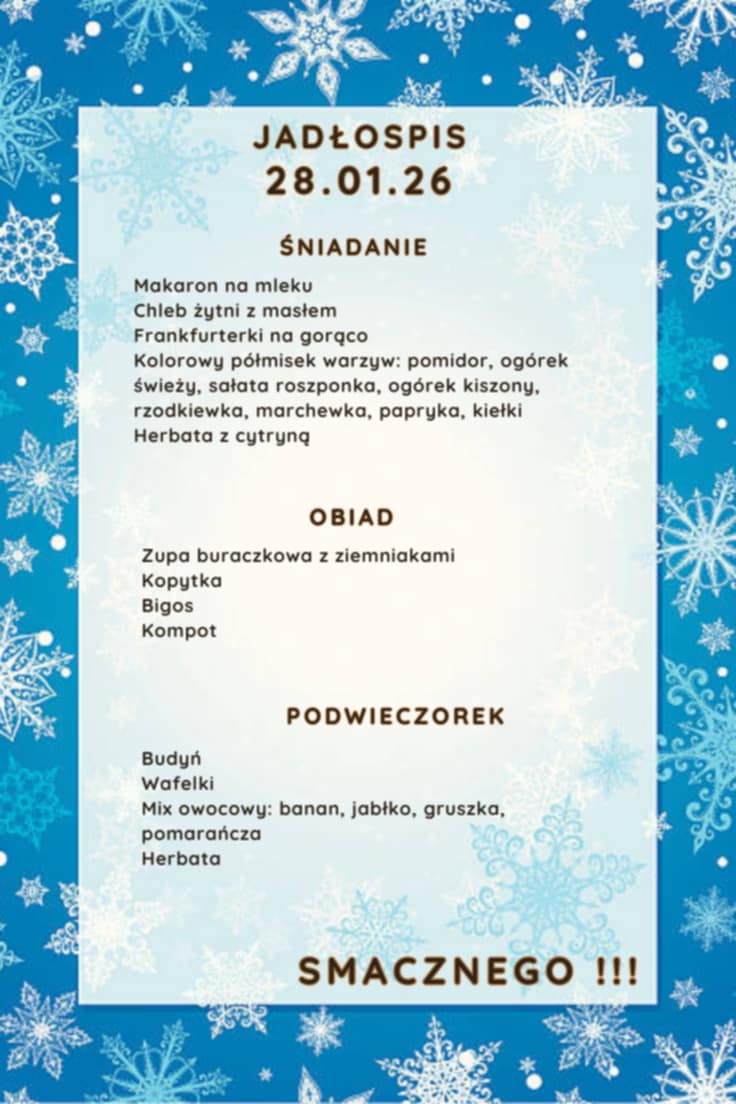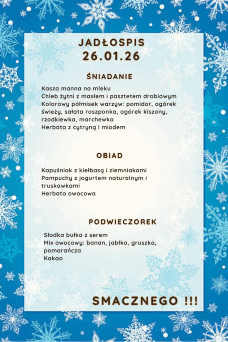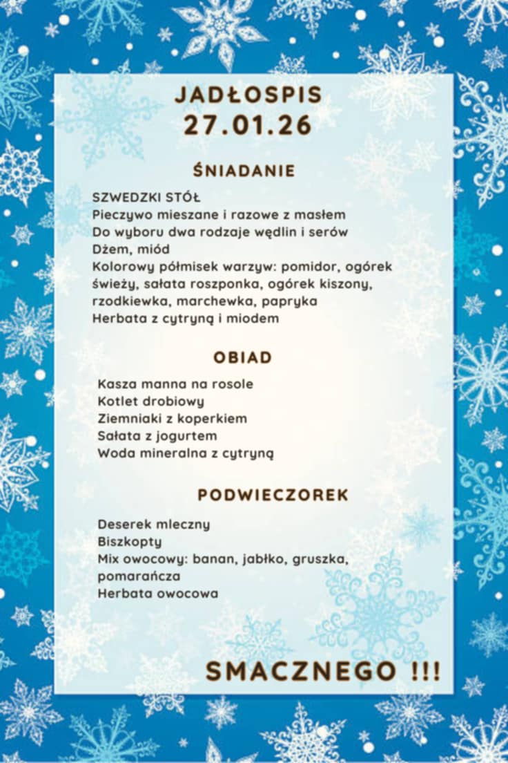 18 obiadów x 5,50 = 99,00 zł. Opłata dotyczy uczniów, którzy nie mają nieobecności i nadpłat. Opłatę za posiłki należy dokonać do 20-go stycznia 2026 r.