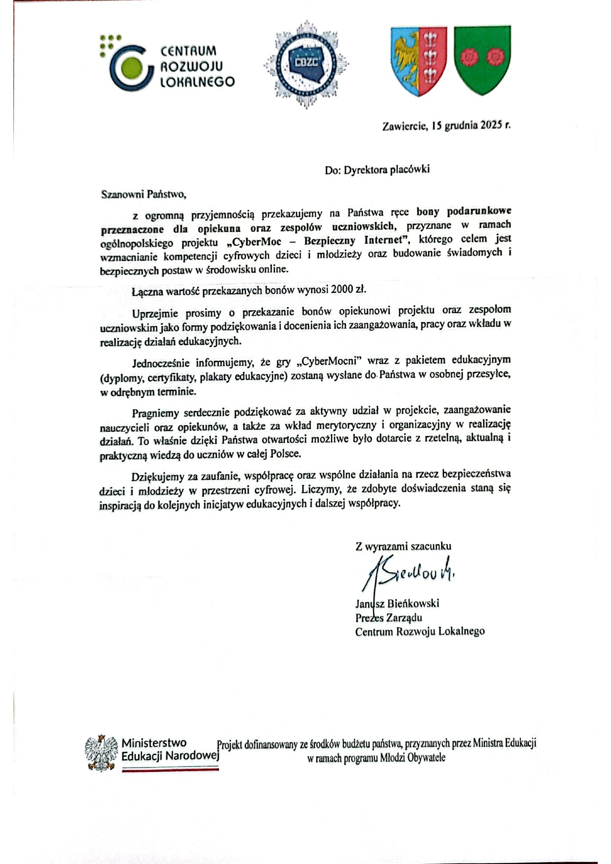 Nagroda 2000 zł za wyróżnienie w Ogólnopolskim Projekcie edukacyjno-profilaktycznym „CyberMoc – Bezpieczny Internet”