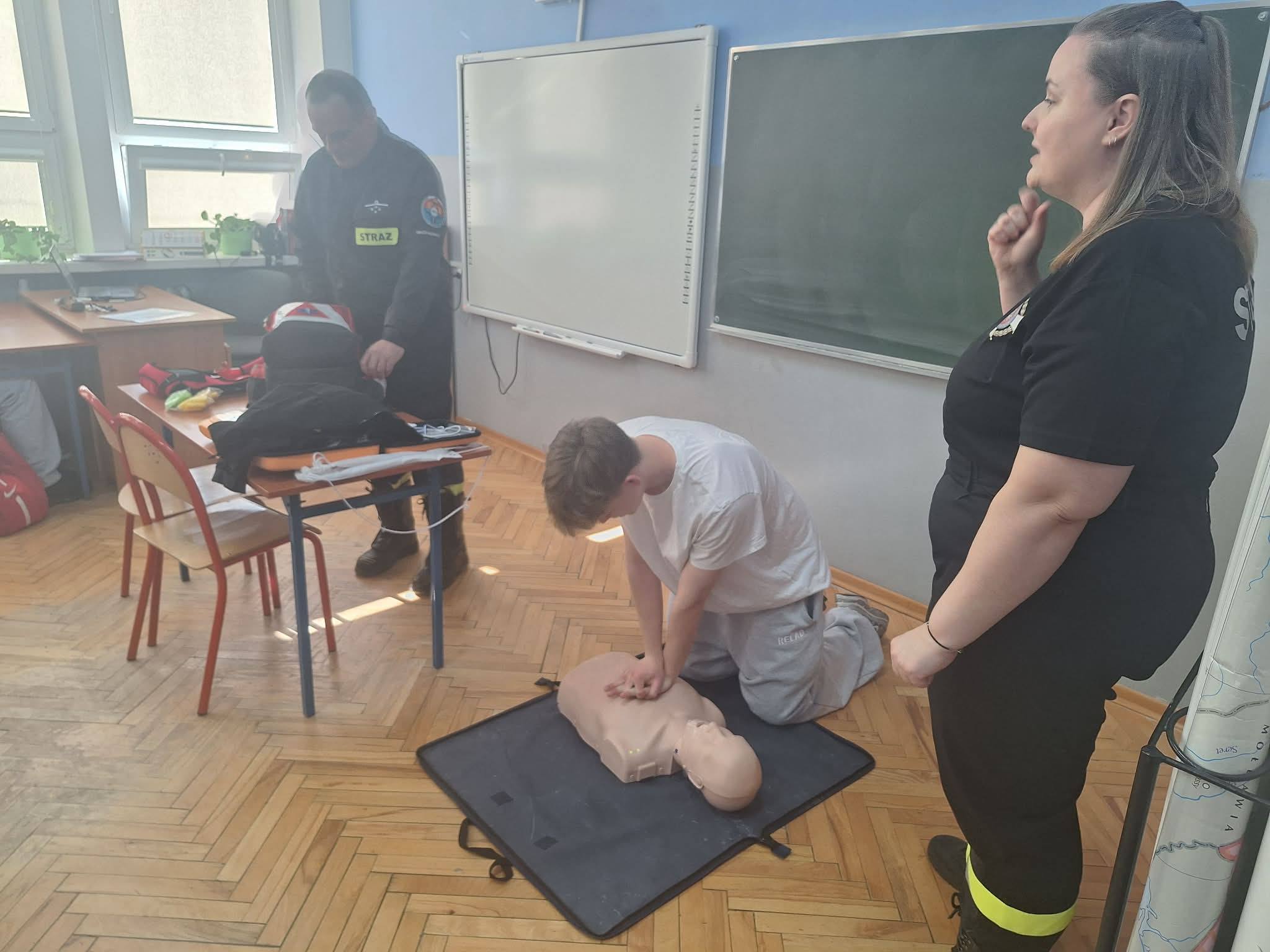 Uczniowie gościli panią Marzenę i pana Sebastiana. Spotkanie okazało się niezwykle wartościową i angażującą lekcją praktycznych umiejętności ratowniczych. Strażacy zaprezentowali uczniom: RKO (resuscytację krążeniowo‑oddechową), użycie AED — wyjaśnili, jak działa automatyczny defibrylator zewnętrzny i jak bezpiecznie korzystać z niego w sytuacji zagrożenia życia. Podczas zajęć strażacy opowiedzieli również o innych zagrożeniach, z jakimi można spotkać się na co dzień oraz o tym, jak ważne jest zachowanie spokoju i szybkie reagowanie w sytuacjach kryzysowych. Uczniowie z dużym zaangażowaniem uczestniczyli w ćwiczeniach, a dzięki profesjonalizmowi i życzliwości naszych gości zdobyli wiedzę i umiejętności, które mogą kiedyś uratować komuś życie.